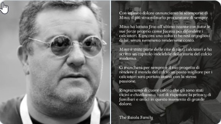 La notizia della scomparsa di Raiola è arrivata tramite una comunicazione da parte della famiglia, diramata attraverso il profilo Twitter del procuratore: